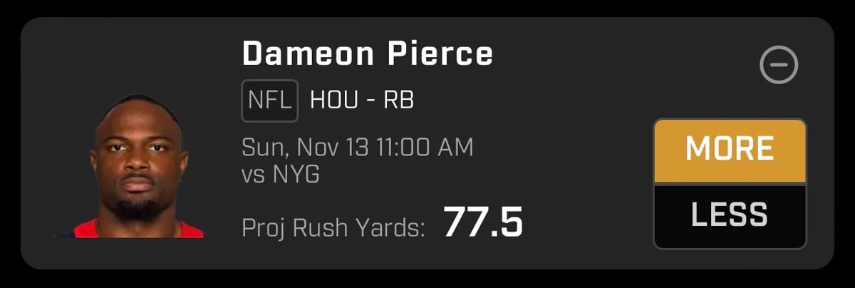 PrizePicks lists Pierce too low this week, so we like the OVER on 77.5 rush yards.