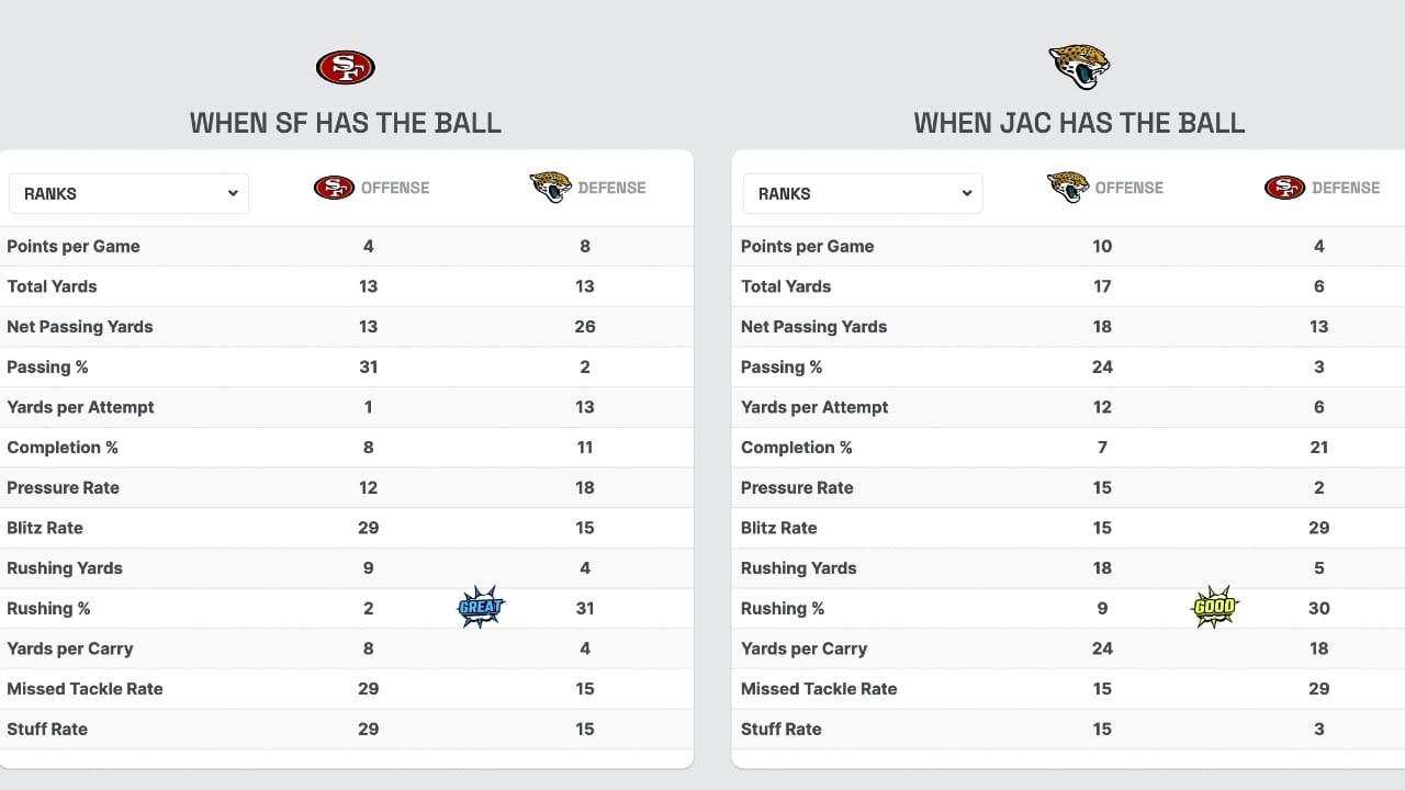 The Jags are 2nd in the NFL in interceptions, but they’re 25th in pressure rate. When Purdy has a clean pocket, his numbers soar: