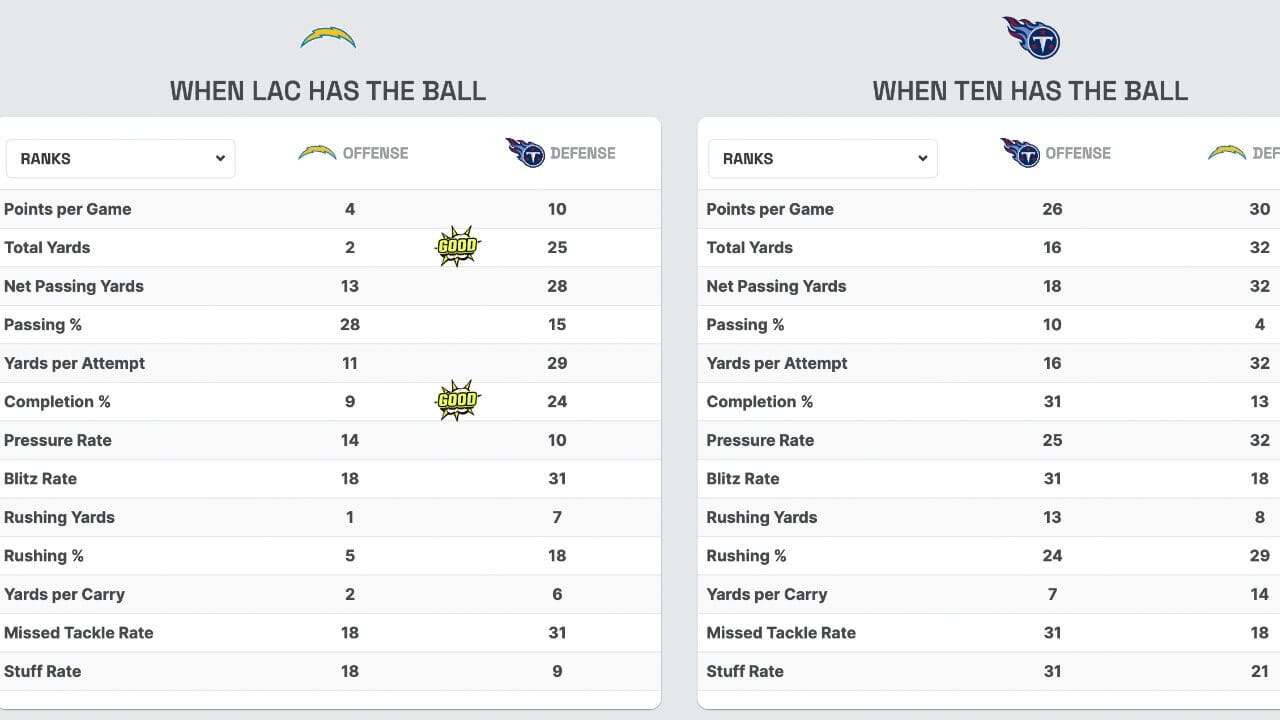 Here’s the game hub from FantasyLife, which has a favorable set of numbers for the Chargers’ offense overall: