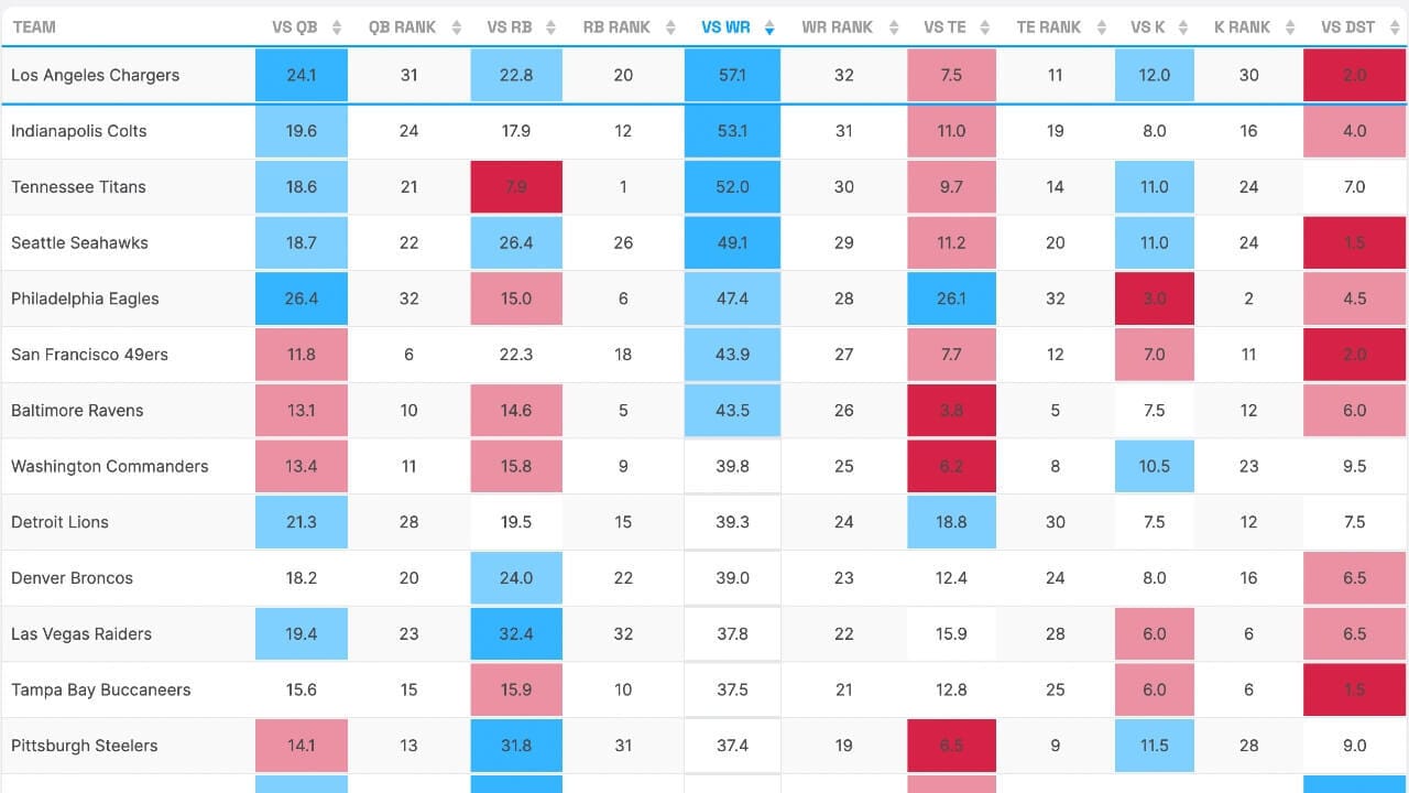A quick peek at the Defense vs. Position tool from Fantasy Life shows just how many fantasy points the Chargers have allowed to the WR position. Addison is the no. 2 behind Jefferson, so there’s production to be had.