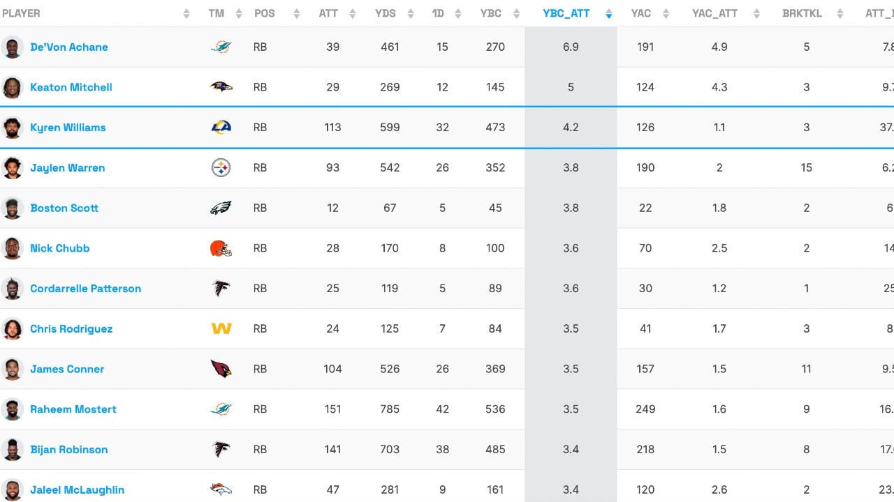 Fantasy Life’s Advanced Rushing Stats have Williams ranked 3rd of all NFL RBs in yards before contact per attempt, which is partly thanks to his own shiftiness and party thanks to the Rams’ O-Line.