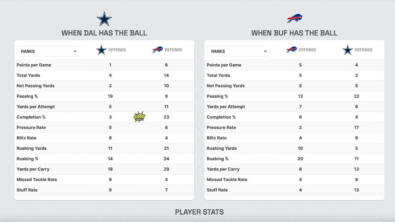 The one thing the Bills have done well recently is pressure the QB, but Dak sort of offsets that. Over the season, when pressured he’s got: