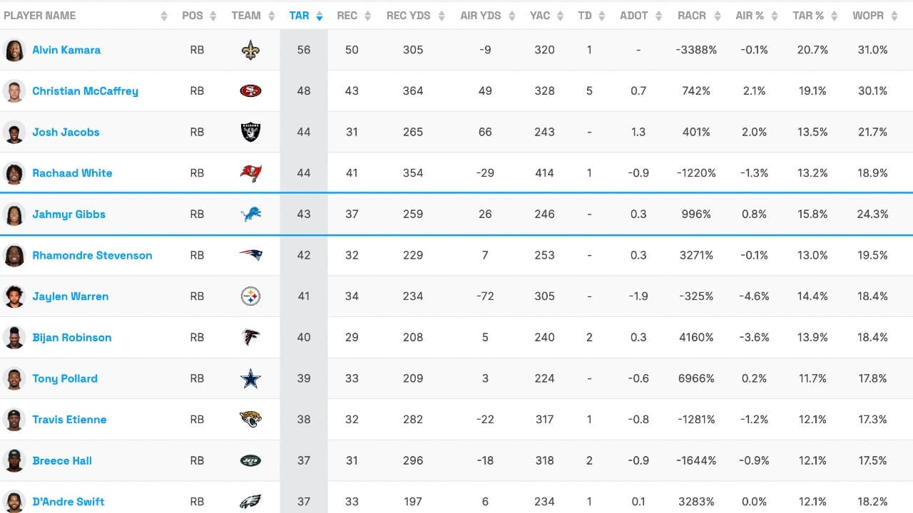 For all the hoopla about Gibbs not getting enough playing time this year, Fantasy Life’s Air Yards tool shows he’s actually 5th in the league in targets, with other strong receiving metrics as well.