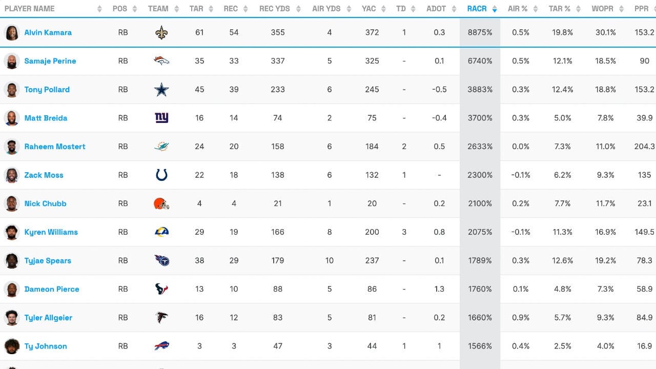 With a combined 109 rushing + receiving yards and 2 scores, Kamara kept the Saints in it against the Lions, despite the team being down early. A quick look at Fantasy Life’s air yards tool shows he leads all NFL RBs in their RACR metric by a long shot. It means he’s excellent at converting his air yards into actual production. He’ll be an asset down the stretch.