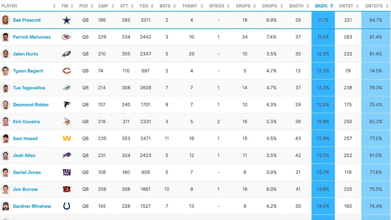 In fact, in the Cowboys’ 3 games since the bye, Dak has been fantasy QB3, QB2, and QB1. And, according to Fantasy Life’s passing accuracy tool, Dak is the most accurate regular starter in the league, with the lowest percentage of bad throws and the highest percentage of on-target throws.