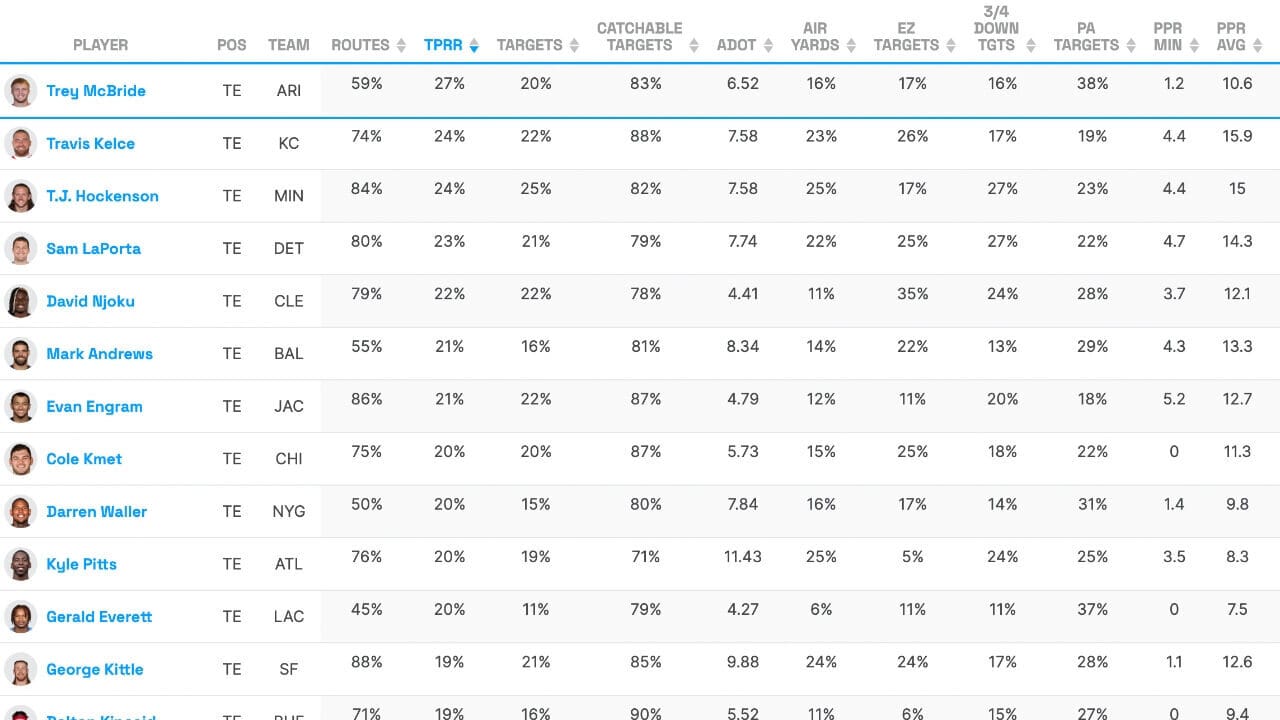 It may surprise you to learn that according to Fantasy Life’s Utilization Report, McBride is now the league leader in targets per route run among all TEs with at least 200 routes. He’s ahead of guys like Travis Kelce, T.J. Hockenson, and Sam LaPorta.