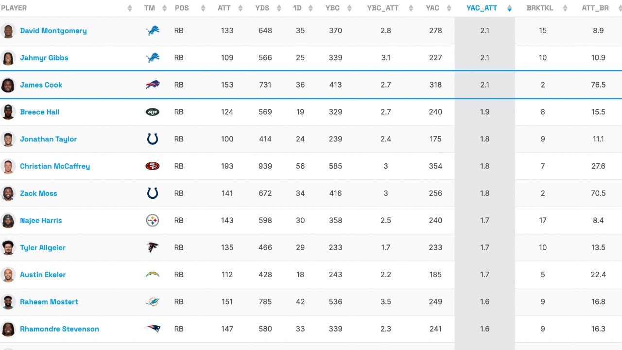 The advanced rushing stats from Fantasy Life don’t lie, and according to them Cook is on the rise. He’s tied for the league lead in yards after contact per attempt, along with a ton of other strong metrics.